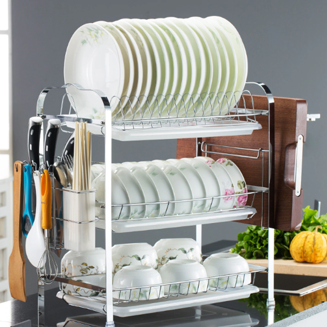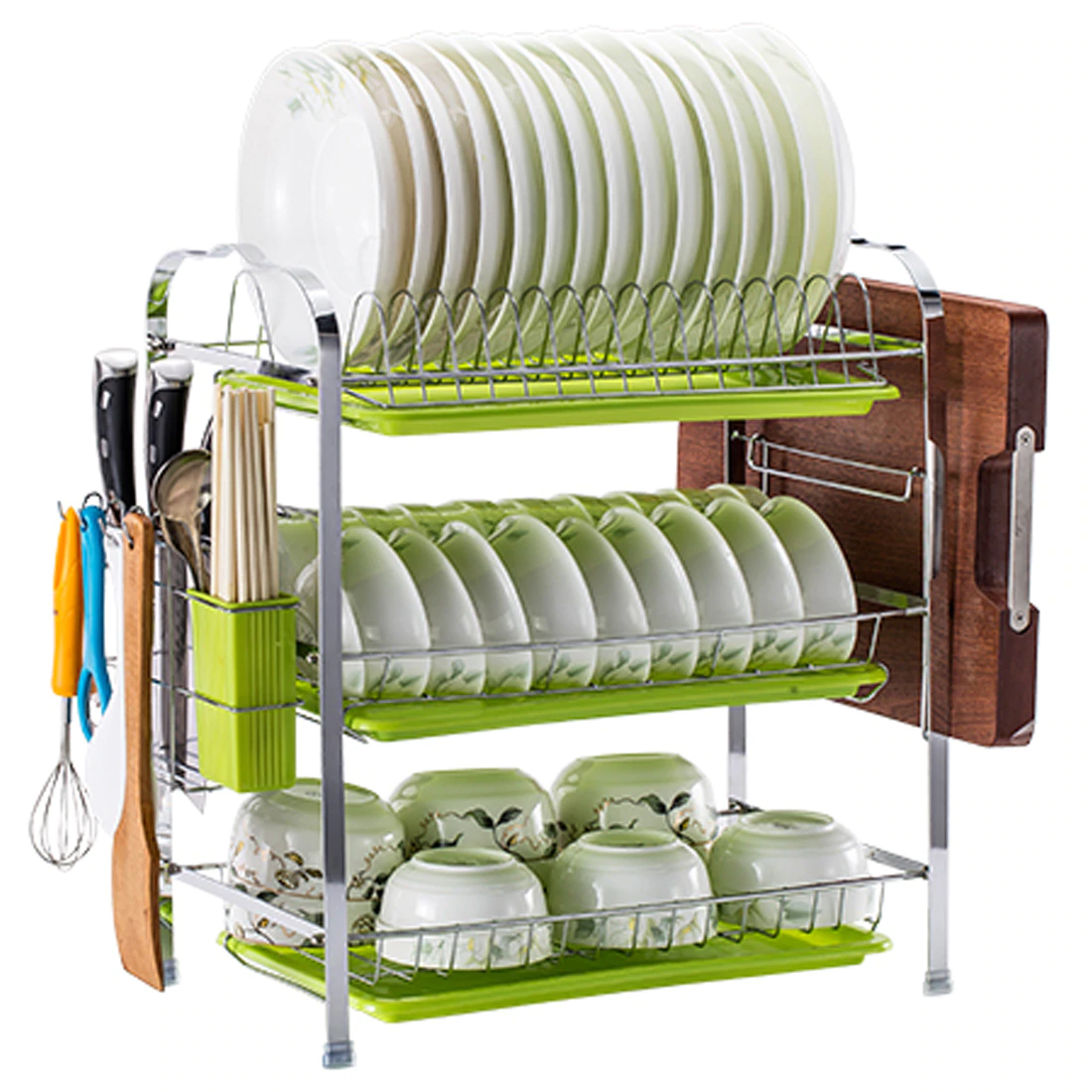 .There is a special dish placement area, which can hold 16 dishes; there is a tool placement area, there are 3 compartments, which can be used to place kitchen knives; a cutting board placement area, which can place 5CM thick cutting boards; there is a special chopstick placement area for convenient chopsticks storage; there is a hanging spoon placement area, there are 4 storage hooks, can hang soup spoons, sundries, etc.; the bowl placement area can be placed 12 bowls, can also be placed cups and other three-dimensional tableware.